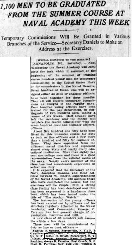 Selden Harold Oviatt was born on July 10, 1887. He enrolled in the United States Naval Reserve Force on July 10, 1917 and would serve until September 28, 1919. Seldon passed away on June 1, 1981.