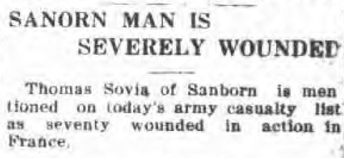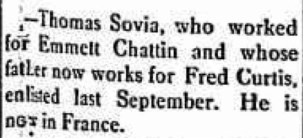 Thomas D. Sovia was born on September 21, 1896, in Ogdensburg, New York. Thomas enlisted in the United States Army at Camp Syracuse in Syracuse, New York, on August 3, 1917; he was killed in action during the Battle of the Aisne, as the division advanced towards Vaux, France, to the south of Belleau Wood, on June 6, 1918.