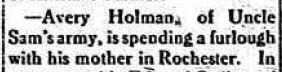 Avery Holman was born on May 28, 1900. He enlisted in the United States Army on June 30, 1918, and would serve until his discharge on July 3, 1919. Avery passed away in April of 1969.