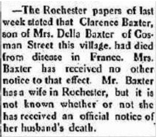 Clarence S. Baxter was born on October 6, 1895. He filled out a World War I draft registration card on June 5, 1917, as required by law. He married one year later on June 26, 1918, and was inducted into the United States Army on July 25, 1918. Clarence was sent overseas on August 26, 1918, and died of pneumonia on October 27, 1918, never setting foot on a battlefield. He is buried in Arlington National Cemetery in Arlington, Virginia.