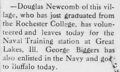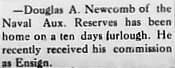 Douglas Alexander Newcomb was born on May 1, 1897. He enrolled in the Naval Reserve Force on April 16, 1918 and on April 22, 1919, he was placed on the Inactive Duty rolls. Douglas passed away on September 29, 1979.