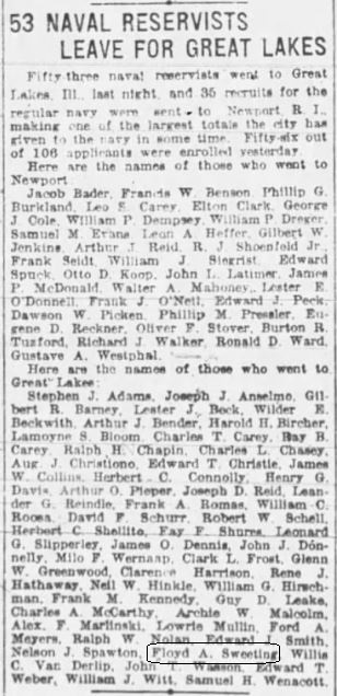 Floyd Arnold Sweeting was born on September 25, 1896, in Spencerport, New York. He enrolled in the United States Naval Reserve Force on July 17, 1918. On October 9, 1918, Floyd died of bronchial pneumonia while on the hospital vessel USS Solace, having transferred from the USS Iowa, in Philadelphia, Pennsylvania.